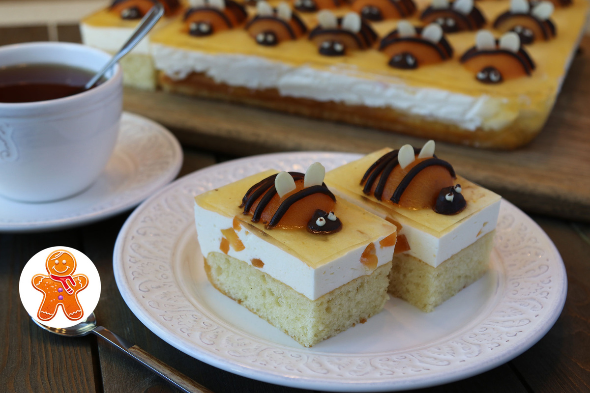 Равномерно распределите крем на остывшем бисквите и уберите в холодильник для застывания. В это время подготовьте украшения: растопите шоколад и создайте пчёлок, придавая их формам. Как только крем схватится, аккуратно разместите фигурки на пироге. Завершите оформление, залив десерт абрикосовым желе. Поставьте в холодильник на несколько часов для полного застывания.