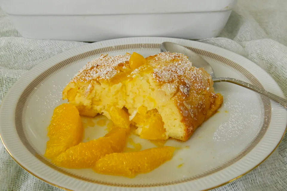 Далее следует подготовить апельсины: необходимо очистить их от кожицы и пленок, чтобы они стали мягкими и приятными на вкус. В смазанную маслом форму выливается половина теста, затем выкладываются апельсиновые дольки, и после этого заливается оставшейся частью теста.