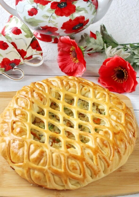 5. Когда тесто увеличилось в объеме, разделите его на две части. Раскатайте одну часть, выложите начинку, отступив от краев на 3-4 см, и защепите края, формируя пирог. Из второй части сформируйте сеточку для украшения, накройте пирог и подверните края под него. Дайте пирогу постоять 25-30 минут в тепле, затем смажьте яйцом и выпекайте в разогретой до 180°C духовке в течение 45-50 минут. Готовый пирог остудите, накрыв полотенцем, сообщает канал.