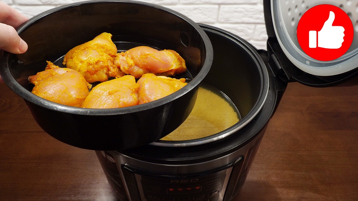 В корзину пароварки поместите подготовленную курицу. Установите корзину на чашу с пшеном и выберите режим «Плов», установив время на 40 минут.