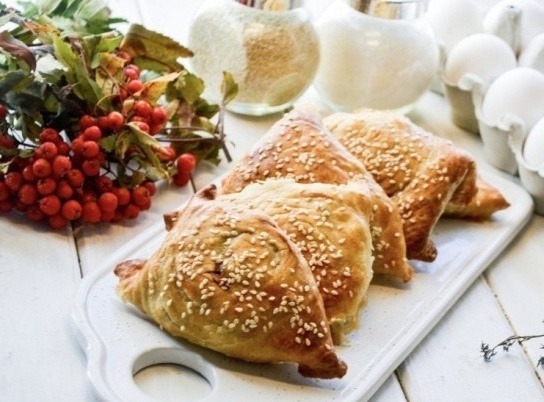 Скрутите тесто в рулет, нарежьте на куски шириной 3-4 см и каждый раскатайте. В центр положите начинку, закройте и защипните тесто, формируя треугольники.