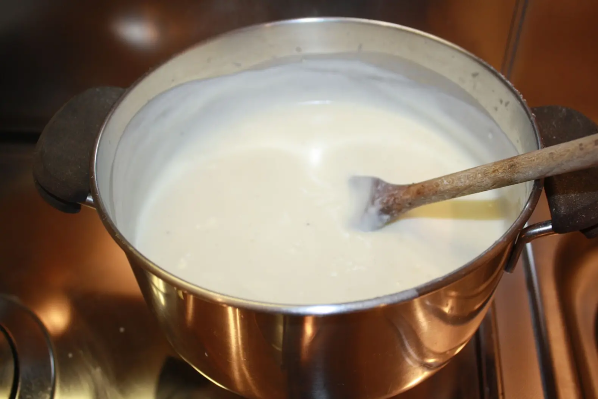 Чтобы создать этот замечательный соус, начните с растворения молотого мускатного ореха в холодном молоке или сливках. В небольшой сотейник положите сливочное масло и растопите его на среднем огне.