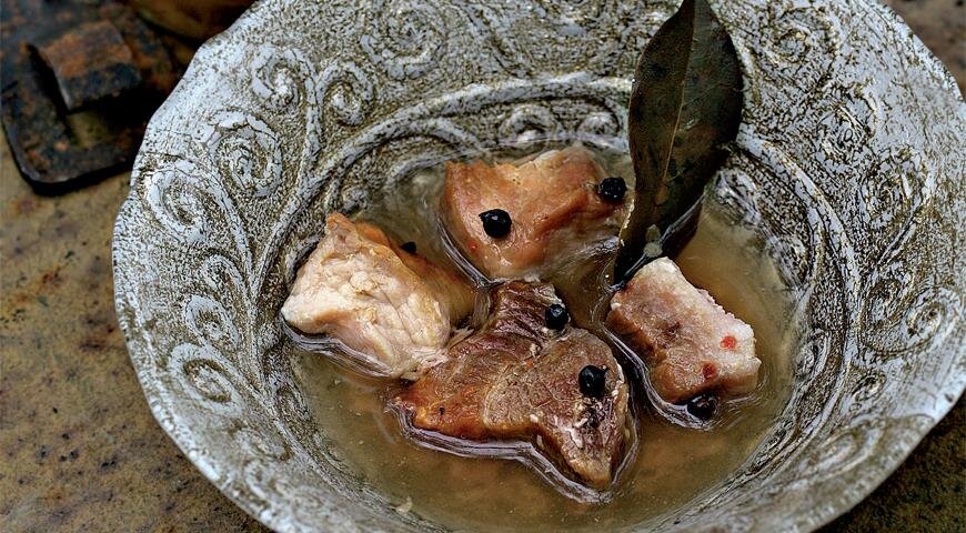 - Переложить остывшую тушенку в заранее подготовленную емкость, выстланную пленкой с краями, свисающими наружу.