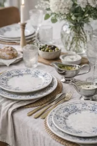 Ключевым трендом этого года стала посуда с выразительными рельефными узорами и нестандартными формами. Такие детали придают вашему столу уникальность и характер. При этом не стоит забывать о свежести композиции; добавьте стеклянные аксессуары, такие как прозрачные вазы и утонченные подсвечники. Они не только освежают образ, но и подчеркивают бархатистую текстуру керамики и фарфора.