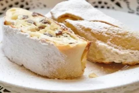 Яйца необходимо разделить на желтки и белки.В муку добавить 25 г сливочного масла, желтки, 2-3 капли уксуса и немного воды. В процессе замешивания теста следует добавлять воду по 1 столовой ложке, в итоге потребуется около 5 столовых ложек. Замесить тесто до получения эластичной и не липкой массы, сформировать шар и смазать его тонким слоем жира.Разогреть пустую кастрюльку на огне и накрыть тесто. Оставить на 25 минут для настаивания.Сформировать из теста длинный брусок и раскатать его от центра к краям до достижения прозрачности. Цель — добиться тонкости, напоминающей тесто фило.После раскатки дать тесту подсохнуть на несколько минут, следя за тем, чтобы оно не пересохло и не стало ломким.Для начинки смешать творог с сахаром и изюмом. Белки взбить до появления пышной пены и аккуратно ввести в творожную массу.Тесто щедро сбрызнуть оставшимся маслом, посыпать толчеными сухарями, выложить начинку и свернуть в рулет.Переложить формовку на смазанный противень и выпекать в заранее разогретой духовке при температуре 180 градусов в течение 40-45 минут.После завершения выпекания дать ретэшу немного остыть, нарезать наискосок и посыпать сахарной пудрой.Этот рецепт обязательно понравится всем любителям сладостей с творогом. Делитесь им со своими друзьями и готовьте вместе!