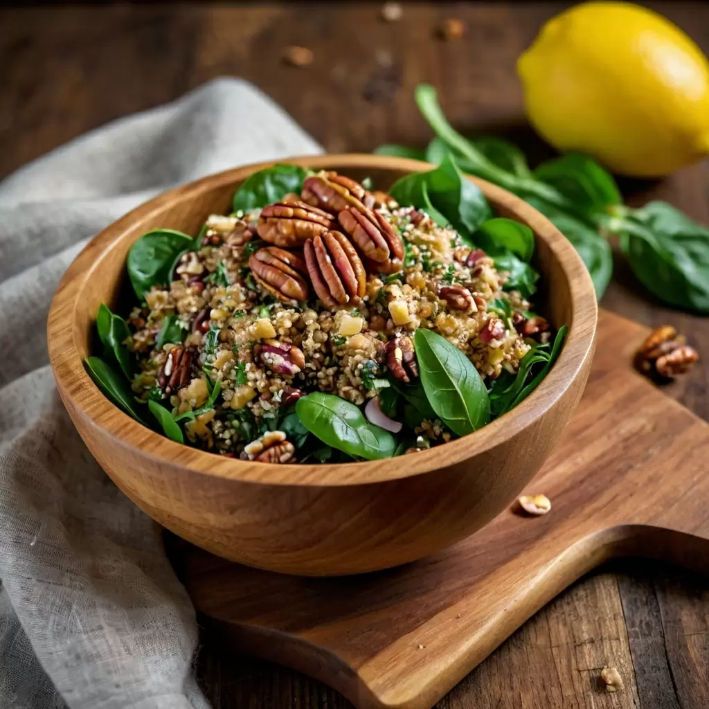 - Процесс приготовления: Приготовьте киноа, обжарьте орехи, смешайте все ингредиенты и подавайте к столу, украсив свежими листьями шпината.