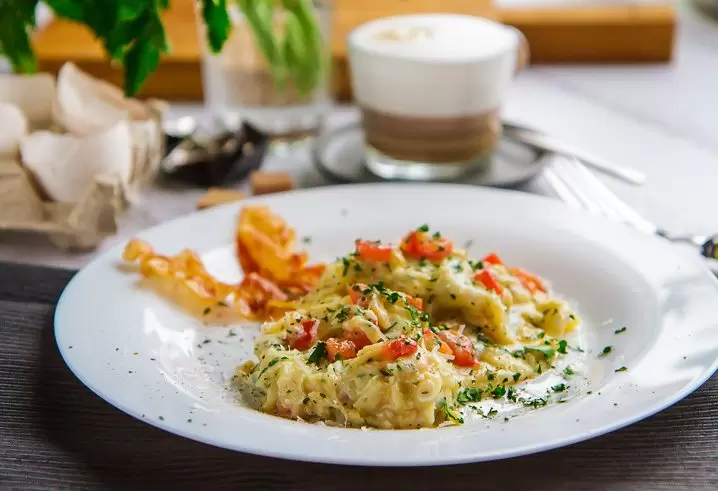 Яйца разбить в миску, слегка подсолить и взбить вилкой. Оставить на 10-15 минут, пока готовятся другие ингредиенты.В зависимости от выбранных добавок, зелень, тертый сыр и мелко нарезанные помидоры следует добавить в яичную смесь непосредственно перед жаркой. Ветчину, грибы, лук и болгарский перец рекомендуют обжарить на сковороде заранее.Если используется бекон, его следует обжарить до золотистой корочки на небольшом огне перед подачей. Для этого сковорода должна быть с антипригарным покрытием.Приготовление без бекона начинается с растопления сливочного масла в сковороде.Растопленное масло залить в яйца, добавить подготовленные начинки и вылить смесь на сковороду.Через 20 секунд перемешивать лопаткой от краев к центру, позволяя жидким частям смешиваться с уже приготовленными. Повторять каждые 10 секунд.Когда почти все жидкие участки исчезнут, в последний раз перемешать и снять с огня – яичница завершит готовиться на остывающей сковороде.Подавать по тарелкам, добавить черный перец, бекон и украсить зеленью с тертым сыром. При желании сбрызнуть трюфельным маслом и сразу подавать.Приятного аппетита!