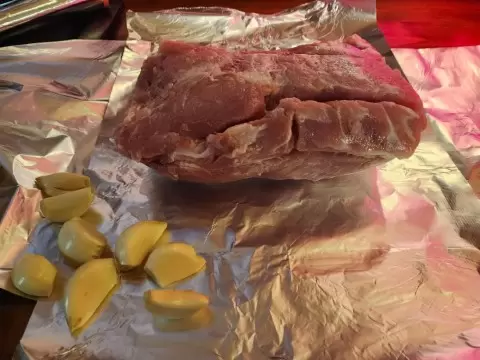 - Подготовка мяса: Расстелите несколько слоев фольги, положите на них мясо. Посолите и поперите его, натрите чеснок и обмажьте им мясо. Заверните фольгу, и отправьте в духовку!