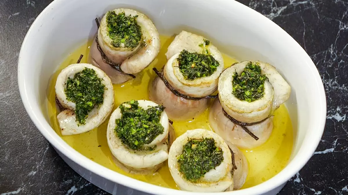 Далее нужно разогреть духовку до 200°C, выбрав режим гриля. Поместите рулетики в духовку и готовьте их в течение 10 минут. После этого рулетики будут готовы: уберите шпагат, полейте их вытопившимся маслом и сбрызните лимонным соком для завершения.
