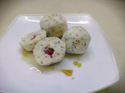 Влажными руками формируются шарики, в каждую из которых аккуратно помещается ягодка. После этого отверстие нужно закрыть, а сам шарик снова придаётся круглой форме. Следующий шаг — добавить шарики в кипящую воду. Когда они всплывут, варить ещё пять минут, после чего аккуратно вынимать. Подавайте вареники, полив их кленовым сиропом для дополнительной сладости.