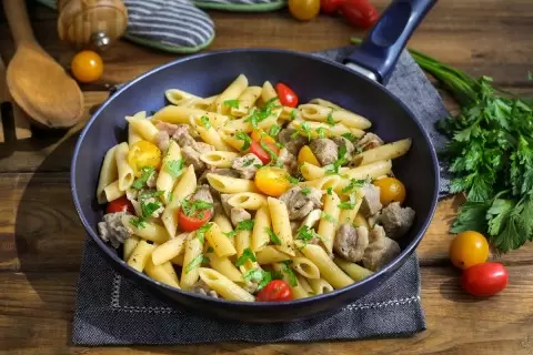По завершении, черри нарежьте пополам и добавьте в сковороду. Перемешайте с пастой и обильно посыпьте рубленной петрушкой. Подавайте данное кулинарное произведение немедленно, наслаждаясь изысканным вкусом и ароматом!