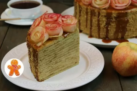 Как только коржи готовы и остыли, можно приступать к сборке: каждый корж промазывается кремом, а верхний слой можно украсить карамельным соусом и кусочками яблок, предварительно подготовленных с использованием желатина.