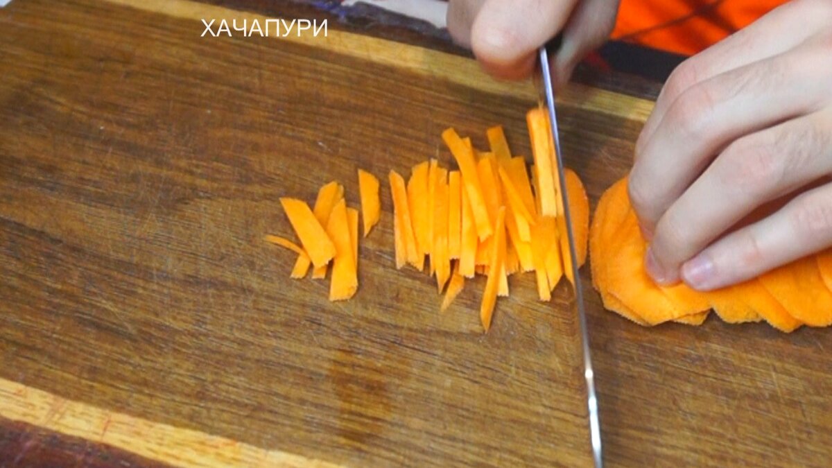 Морковь нарезать тонкой соломкой. Можно использовать специальную терку, но традиционный способ тоже отлично сработает.