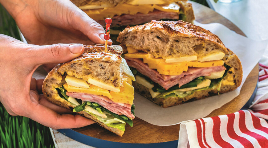 Такой сэндвич станет настоящим хитом любого пикника благодаря своему яркому вкусу и красивой подаче. Не забывайте, что правильная упаковка — залог успеха: заверните нарезанный сэндвич в пленку, если планируете брать его с собой.