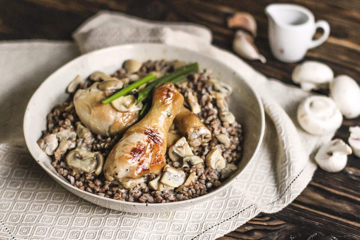 Подача: Серверовать гречку с куриными голенями, украшенными сливочно-грибным соусом. Это блюдо будет вкусно и сытно, идеально подойдет для семейного ужина.
