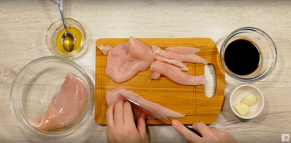 Начнем с куриной грудки, которую нужно нарезать на длинные полоски. Это обеспечит равномерное маринование и добавит закуске особую текстуру.
