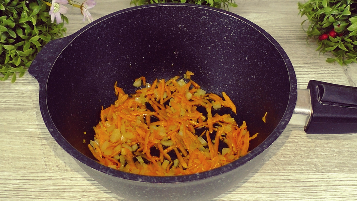 В небольшой сковороде разогреть растительное масло и обжарить нарезанный лук с тертой морковью до мягкости. Затем добавить горячую воду и довести до кипения.