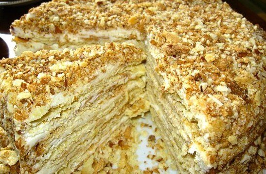 1. Приготовление теста: В муку выложить нарезанное на мелкие кубики масло и аккуратно порубить ножом. Сформировать муку в горку и, смешивая с холодной водой (с солью), замесить однородное тесто. Разделите его на 9 равных частей, раскатайте в тонкие коржи толщиной не более 2 мм и выпекайте при температуре 180 градусов около 15–20 минут.