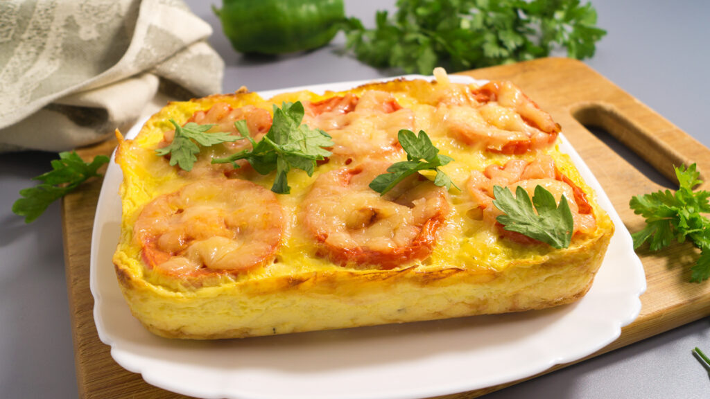 Сверху можно украсить помидорами и посыпать оставшимся сыром. Запекать в разогретой до 180 градусов духовке потребуется 35-40 минут. Готовое блюдо должно приобрести аппетитный золотистый цвет.