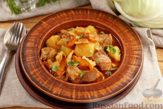 - Жаркое из свинины с картошкой и капустой — это сытное блюдо, в котором свинина сочетается с мягкими овощами, придавая им неповторимый вкус.