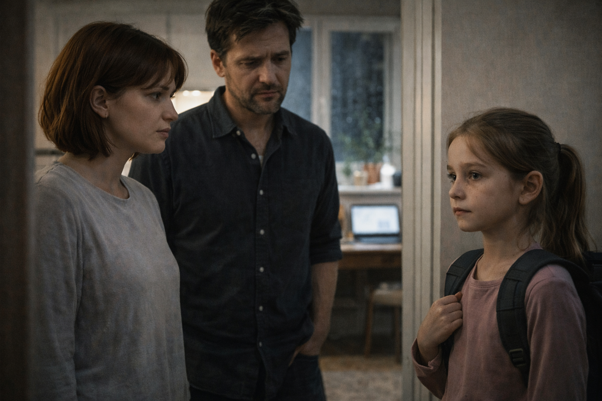 На кухне царил аромат остывшего ужина, а за окном капал дождь, придавая атмосфере ещё большую тревожность. У двери стояла девочка в возрасте около восьми лет с рюкзачком, её глаза выдавали недетскую мудрость.