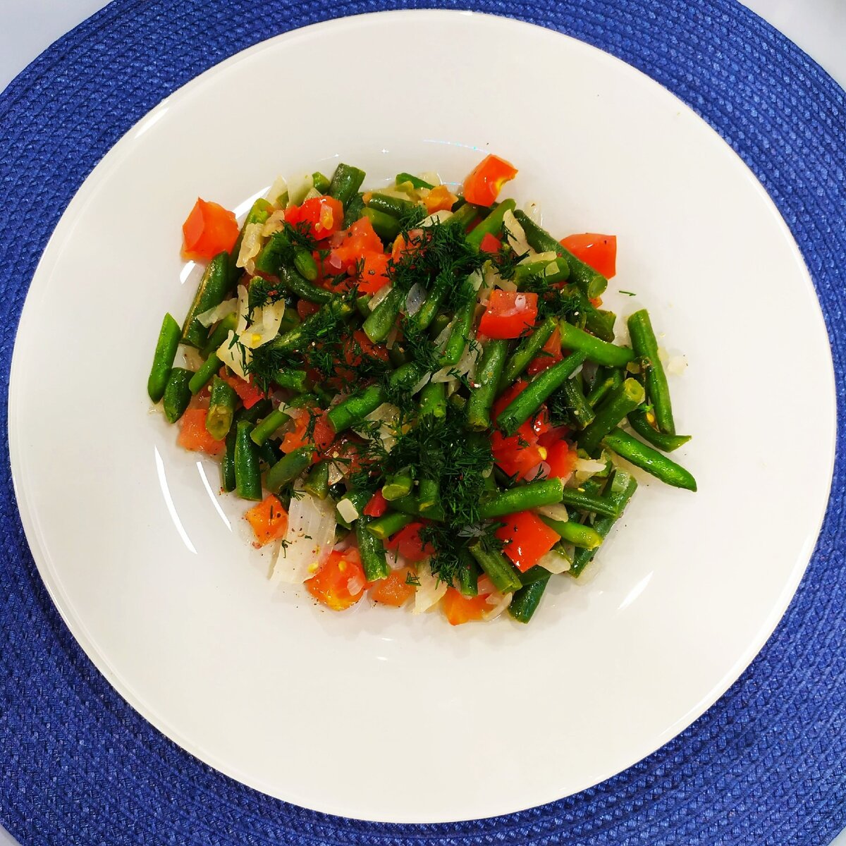Затем добавьте стручковую фасоль и готовьте около 6 минут, с добавлением сухого базилика и немного воды. Накройте крышкой и тушите еще около 10 минут, до состояния, когда фасоль останется слегка хрустящей. В конце добавьте соль, перец и нарезанный укроп, тщательно перемешайте.