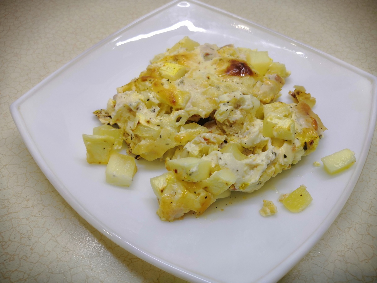Все подготовленные ингредиенты объединить в глубокой миске. Вмешать яйца, греческий йогурт и приправы. Для аромата отлично подходят чеснок и томаты, поэтому рекомендуется использовать соответствующие специи, а также карри и хмели-сунели. Всю массу тщательно перемешать.