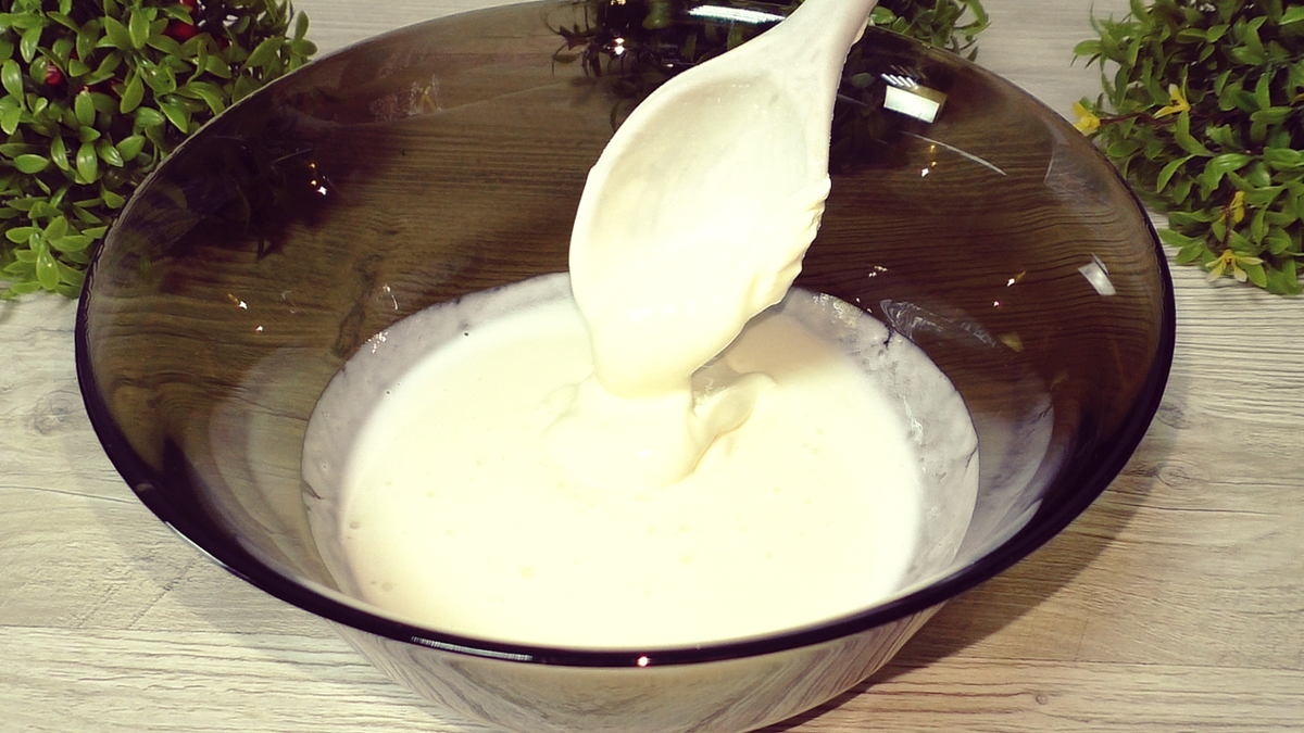 В большой миске нужно аккуратно объединить теплый кефир и сметану. Подходят оба продукта, но можно обойтись только кефиром. Придавая вкус, добавляется щепотка соли и сахар. Затем вливаем мед, но при необходимости его можно заменить на сахар.