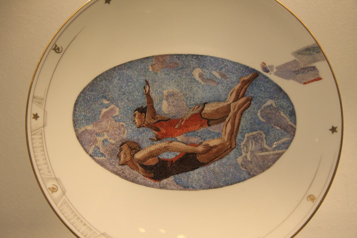 На выставке «Россия, вперед», которая знакомит посетителей с темой спорта в декоративно-прикладном искусстве, представлена тарелка, воспроизводящая запоминающееся изображение, на котором словно парят фигуры людей. Эти мозаичные элементы вдохновляют на новые открытия и заставляют задуматься над богатством культурного наследия.