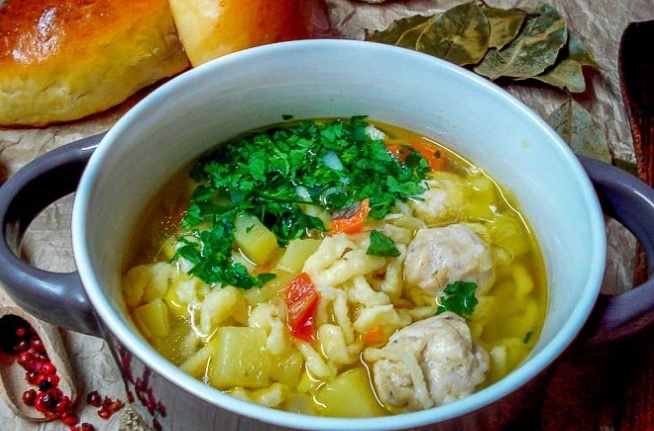 Фарш приправляится свежемолотым перцем и солью. Из него формируются небольшие фрикадельки. В прошло 10 минут после добавления картофеля в бульон, фрикадельки аккуратно опускаются в кастрюлю, не разбивая суп.