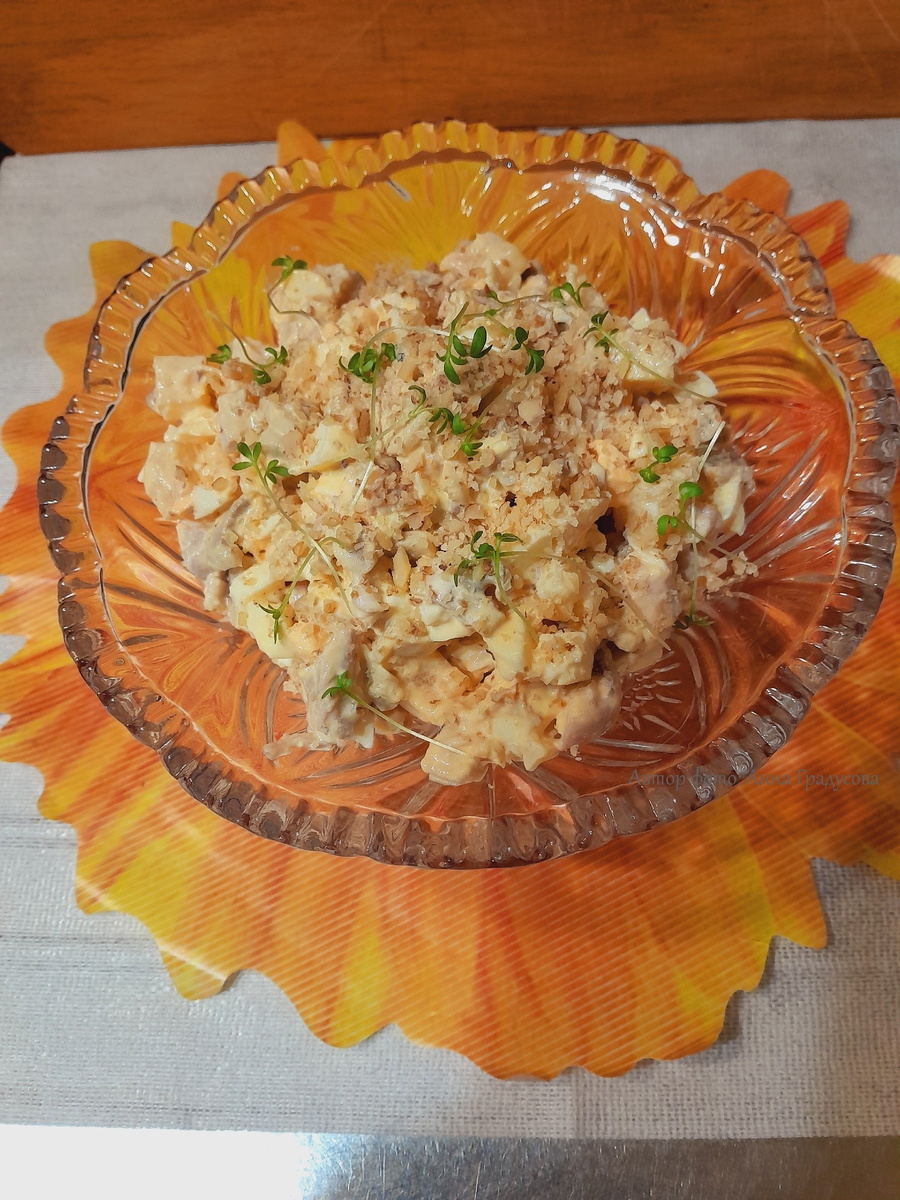 Консервированные шампиньоны нарезаются тонкими ломтиками. Все ингредиенты складываются в одну миску, где добавляются соль, молотый черный перец и ложка майонеза. Затем все тщательно перемешивается. Для завершения блюда мелко нарубленные грецкие орехи можно добавить сверху, чтобы они не только украсили салат, но и добавили особый вкус.