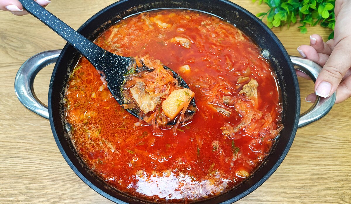 Готовый борщ следует подавать горячим, с ложкой сметаны и свежим хлебом. На следующий день он станет еще вкуснее, ведь все вкусы идеально соединятся. Главное, не спешить: дайте ему настояться хотя бы 20–30 минут перед подачей.