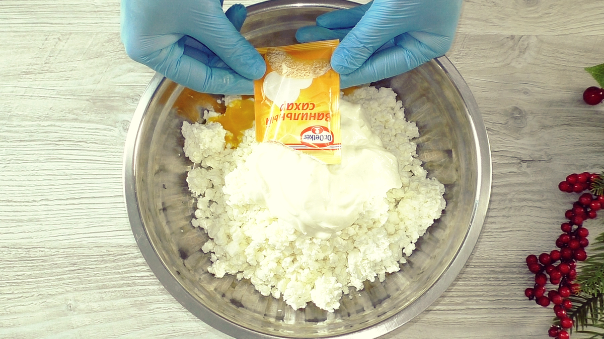 Сначала в глубокой миске смешивают творог, два желтка, ванильный сахар и щепотку соли со сметаной. Все это нужно перебить блендером до однородной консистенции.
