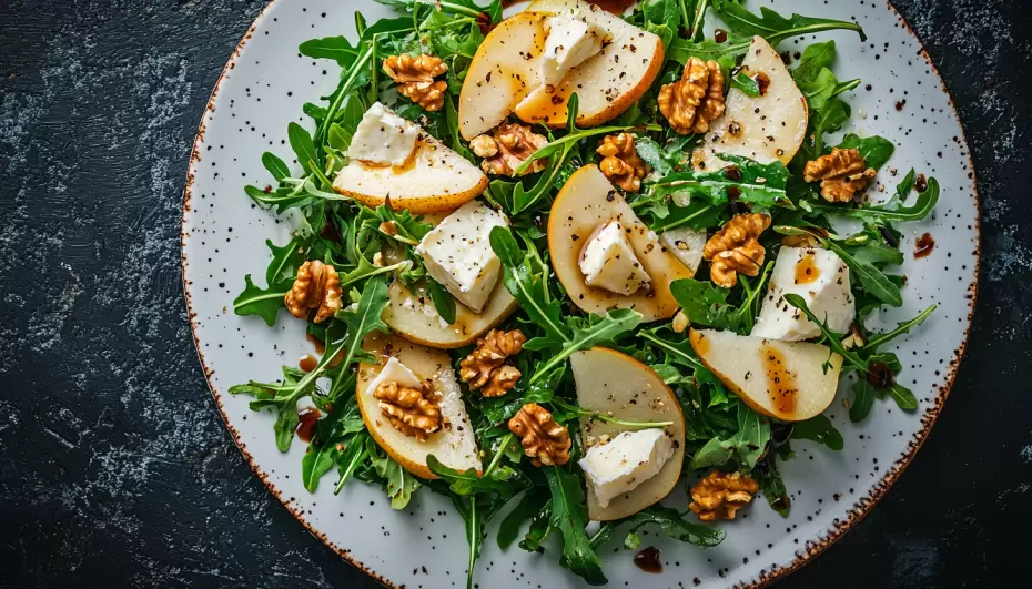 Для начала нарезать грушу тонкими дольками и камамбер кубиками. Обжарить грецкие орехи на сухой сковороде до золотистого цвета. В салатник добавить нарезанные грушу, камамбер и орехи, а затем добавить немного руколы для освежающего эффекта. Заправка сделает блюдо незабываемым: просто смешайте оливковое масло, бальзамический уксус, соль и перец.