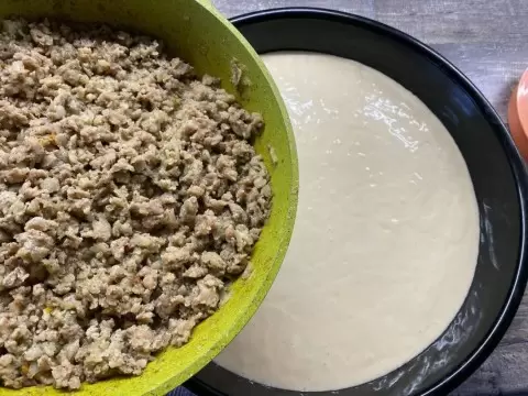 Далее нужно смазать форму для выпечки маргарином, вылить половину теста и поставить в разогретую духовку на 5 минут, чтобы тесто успело схватиться. Затем добавляется начинка и оставшееся тесто, а по желанию — семена кунжута. Пирог выпекается до готовности.