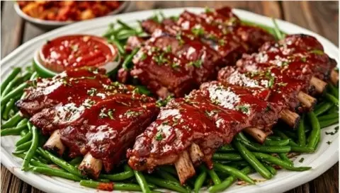 Тем временем соединить консервированную и стручковую фасоль с оставшимся соусом и горчицей, подогревая на гриле в течение 15 минут. В итоге изысканные ребрышки подают вместе с аппетитной фасолью, создавая не только вкусное, но и красивое блюдо.