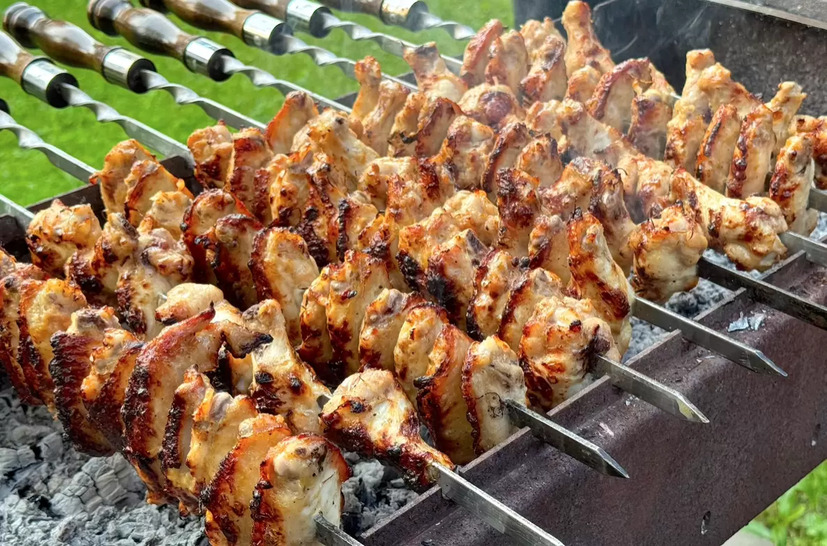 По истечении времени куриные крылышки можно нанизать на шампуры и жарить на углях до появления румяной корочки, периодически переворачивая их для равномерного запекания. Результат — румяные, ароматные и невероятно сочные крылышки, которые мгновенно завоюют сердца всех участников застолья.