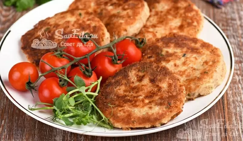 Получившуюся массу делят на пять частей и формируют котлеты, обваливают в муке и обжаривают с обеих сторон до румяной корочки на среднем огне. Готовые котлеты получаются нежными и ароматными.