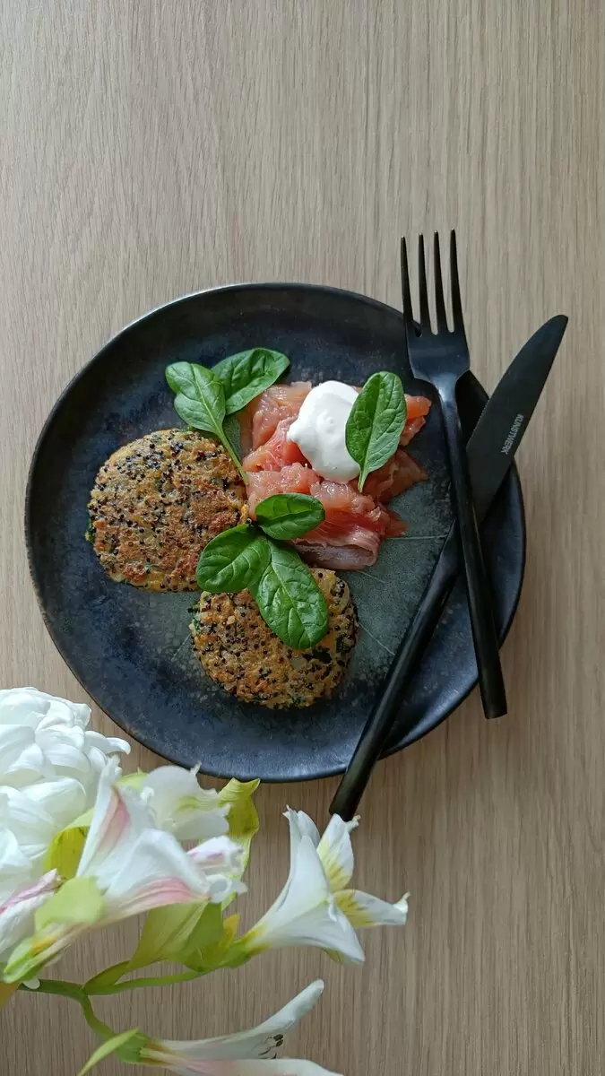 Смешав пассерованные овощи с киноа, добавляют два яйца и муку, солят и перчат по вкусу. Затем формируются котлеты и обжариваются на сковороде. Это простое и быстрое блюдо станет отличным вариантом для обеда, а котлеты отлично сохраняют свои вкусовые качества даже в холодном виде. Котлеты из киноа можно подавать с различными соусами и гарнирами, что придаёт блюду разнообразие и насыщенность.