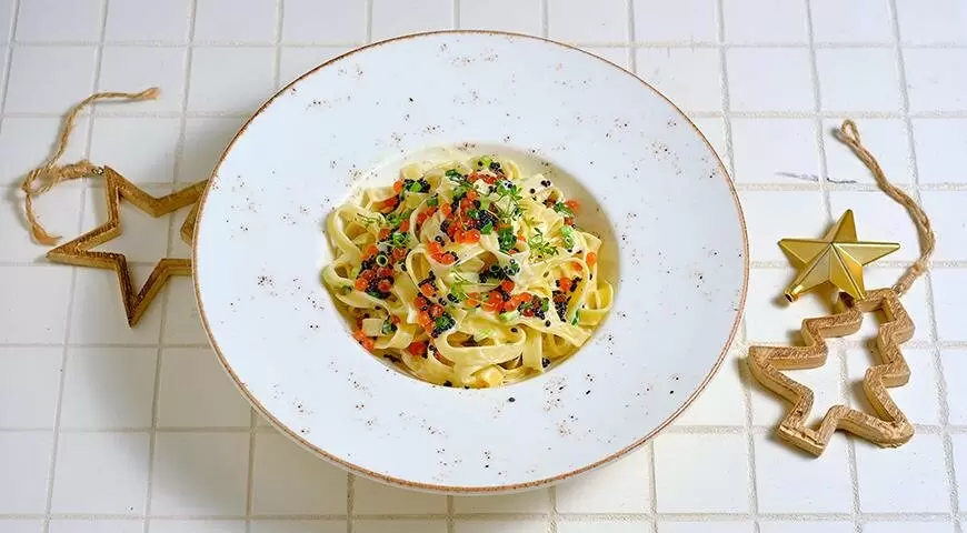 Аккуратно добавьте тальятелле в сливочный соус и прогрейте их еще минуту. Подавайте горячую пасту на подогретых глубоких тарелках, поливая сверху икрой. Это блюдо станет отличным завершением праздничного ужина.