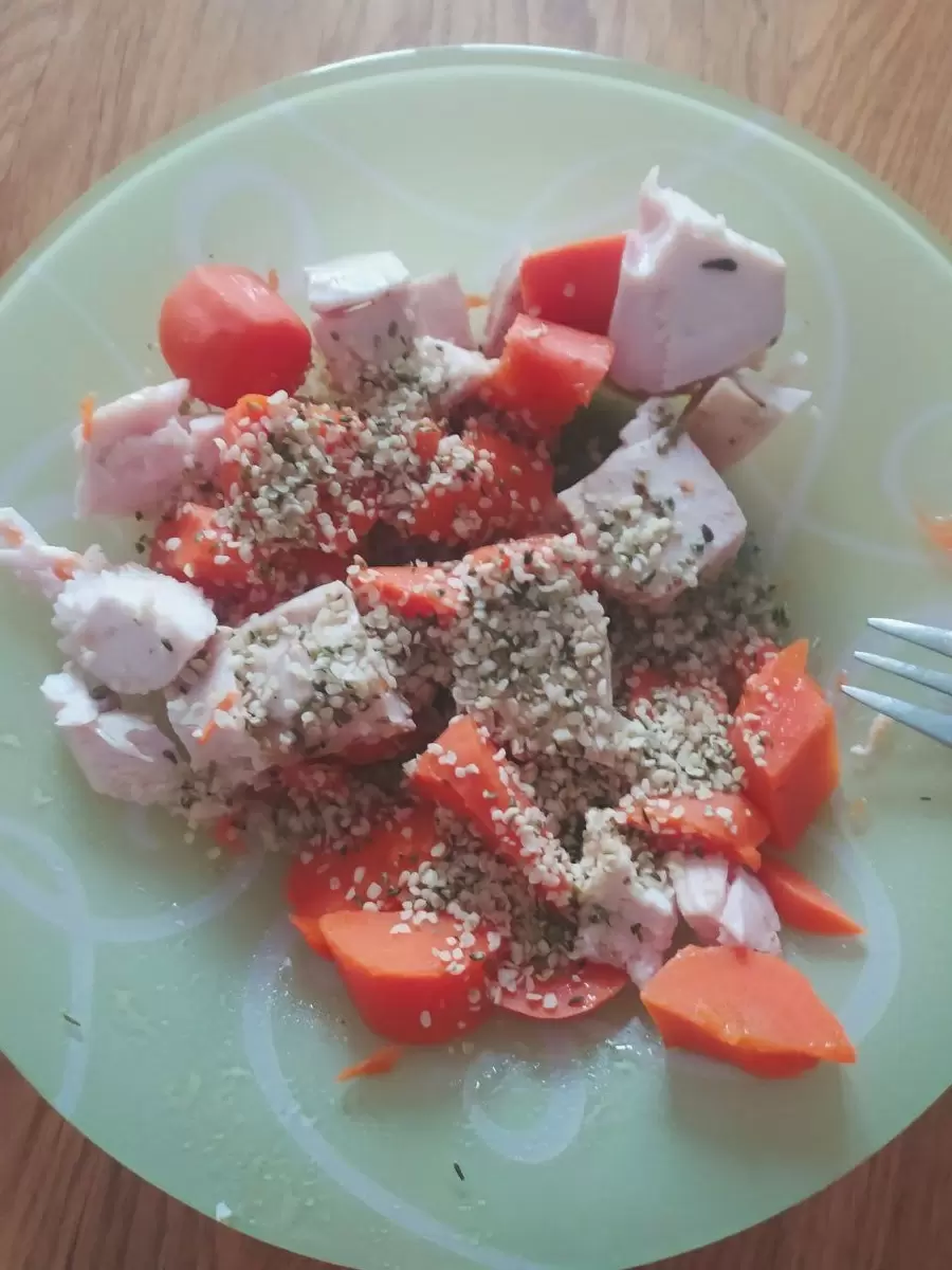 Чтобы приготовить это восхитительное угощение, достаточно отварить куриную грудку и морковь, а затем нарезать их на кусочки. В салатнице аккуратно перемешать курицу с морковью, добавить семена конопли и освежить всё соком лимона. Полить оливковым маслом и тщательно перемешать.