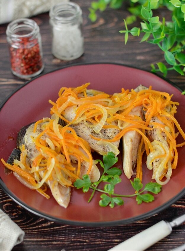 3. Нарежьте рыбу на порционные куски, добавьте соль и перец по вкусу. Лук следует нарезать полукольцами, а морковь можно натереть на тёрке или нарезать соломкой.