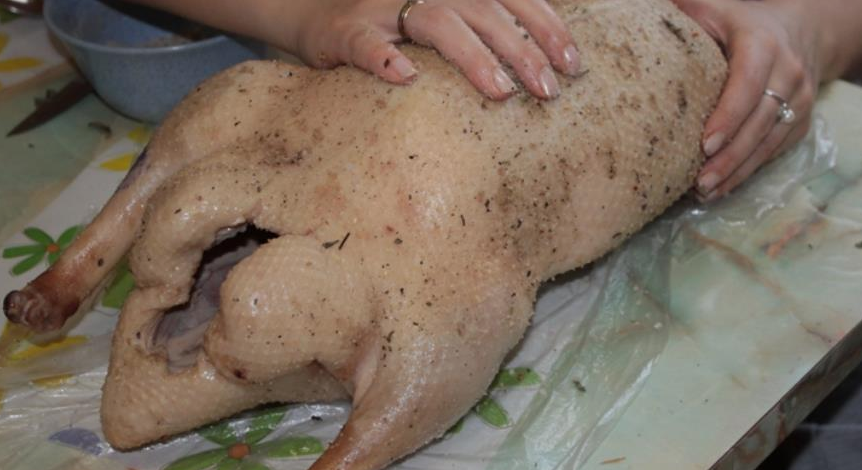 Начать стоит с подготовки тушки. Натрите гуся солью со всех сторон и дайте ему постоять 15 минут — это время необходимо, чтобы мясо пропиталось.