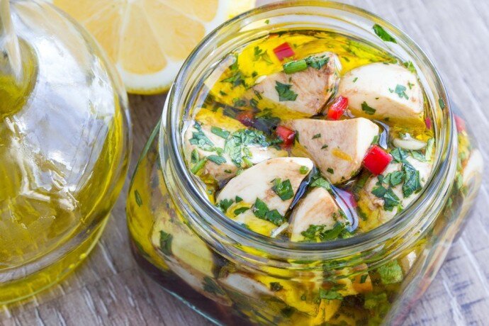 В глубокой миске соединить все компоненты для маринада, добавив подготовленное оливковое масло с чесноком. Хорошо размешать, добавив соль и уксус.